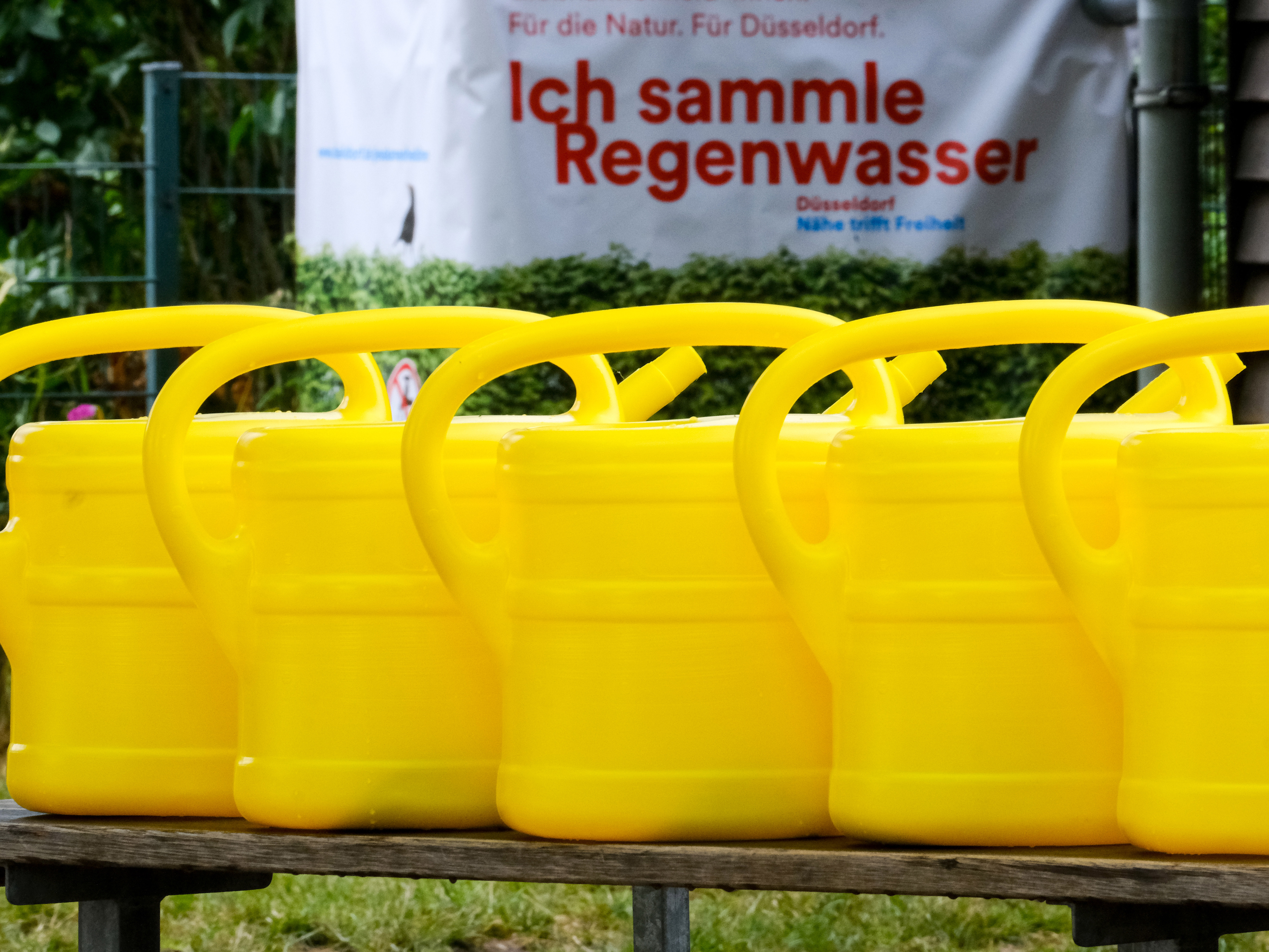 Während der Regentage Wasser sammeln und so in der Trockenzeit die öffentlichen Bäume und Grünflächen versorgen – das ist das Prinzip der Aktion „Dein Fass – Gießkannenheldinnen für Düsseldorf“. Die Stadt vergibt für den Zweck große Regenfässer.