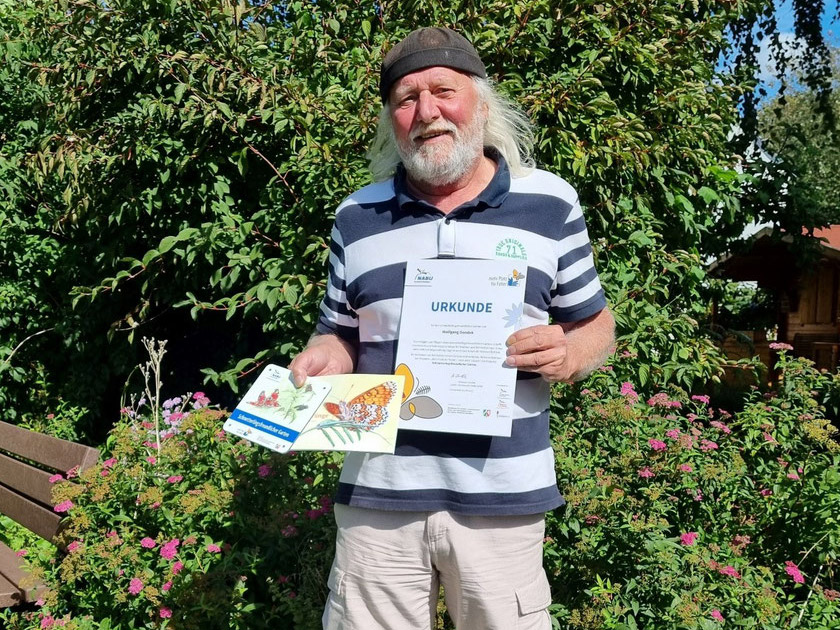 All diese Kriterien haben Wolfgang Gondek und sein Garten mit Bravour erfüllt. Nicht ohne Stolz präsentiert er die Urkunde, die ihm der NABU verliehen hat, ebenso wie die Plakette, die gut sichtbar neben dem Türschild angebracht ist.