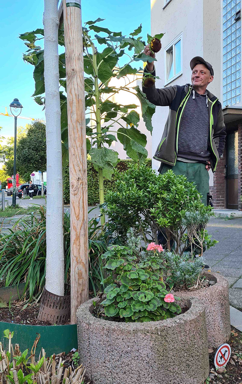 In Wersten erproben Mieterinnen und Mieter der SWD schon seit längerem viele Ideen rund ums ‚Urban Gardening‘. Auf der Küppersteger Straße erfreut die Baumscheibe vor der Haustür von Herrn Grubert seine eigene Familie und die Nachbarschaft als schöner Blickfang. Ehemals als ‚Hundeklo‘ missbraucht blühten den gesamten Sommer über die Blumen.
