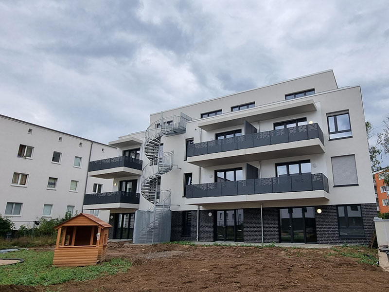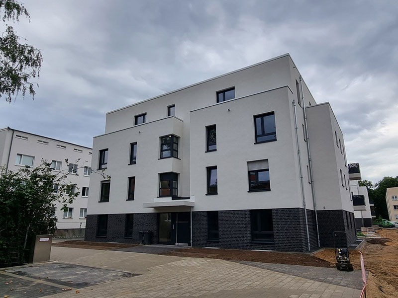 Am letzten der vier Neubauten, der Benzstraße 12, wird zurzeit noch gearbeitet. Ende September sollen hier die Arbeiten ebenfalls abgeschlossen sein. Bereits im Oktober können die Mieterinnen und Mieter dann hier einziehen. Da diese Wohnungen für diejenigen Mieter geschaffen wurden, die im Rahmen der Hellweg-Sanierung umziehen müssen, sind schon jetzt alle Wohnungen vergeben.