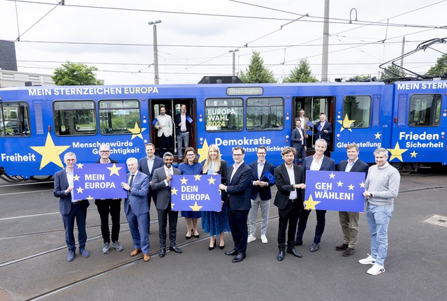 „Mein Europa. Dein Europa. Geh wählen!“ Unter diesem Motto werben Vertreter zahlreicher Stadttöchter seit Dienstag für die Teilnahme an der Europawahl am kommenden Sonntag. Vor der Europawahl-Bahn der Rheinbahn, die seit Ende April durch Düsseldorf fährt, rufen Geschäftsführende und Vorstände der Bädergesellschaft Düsseldorf, der Connected Mobility Düsseldorf (CMD), von D.LIVE, des Düsseldorf Airports, von Düsseldorf Marketing / Visit Düsseldorf, der IDR, der Rheinbahn, der Stadtsparkasse Düsseldorf, der Stadtwerke Düsseldorf, der SWD Städtische Wohnungsgesellschaft Düsseldorf sowie der Tonhalle Düsseldorf dazu auf, Europa am 9. Juni eine Stimme zu geben. In einem gemeinsamen Film weisen die Unternehmen zudem auf die zentralen Werte hin, die das Leben in der Europäischen Union prägen.
