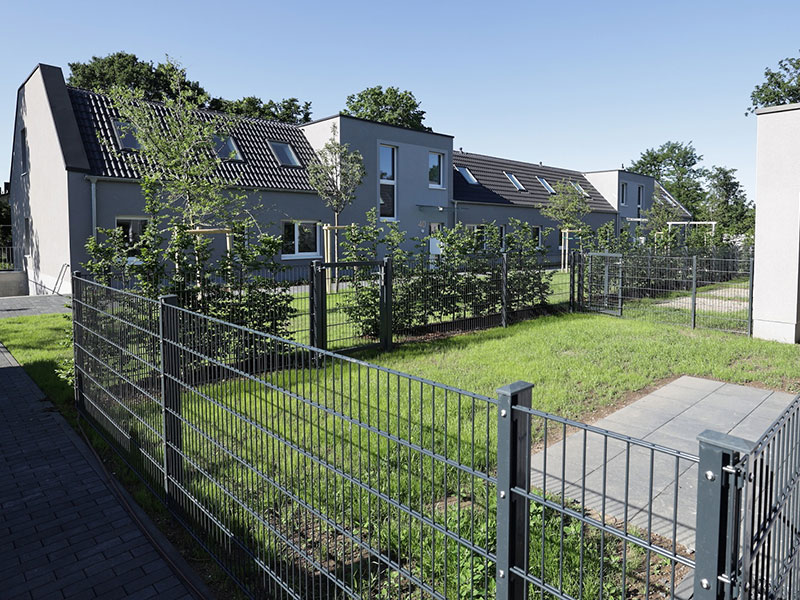 Direkt neben einer Reihenhaussiedlung sind zwei einander gegenüberliegende Gebäude entstanden, die jeweils zehn Wohnungen bieten. Zwischen den beiden lang gezogenen hellgrau gestrichenen Baukörpern sowie um sie herum kennzeichnet viel Grün die Siedlung und sorgt für ein attraktives Wohn- und Lebensumfeld. Die Mieterinnen und Mieter in den barrierefrei erreichbaren Parterrewohnungen können sich auf ihre Mietergärten freuen, während die Wohnungen der ersten Etage großzügige Balkone bieten. Für Kinder stehen auf der Grünfläche im Zentrum Spielgeräte und viel Platz auf dem Grün zur Verfügung.