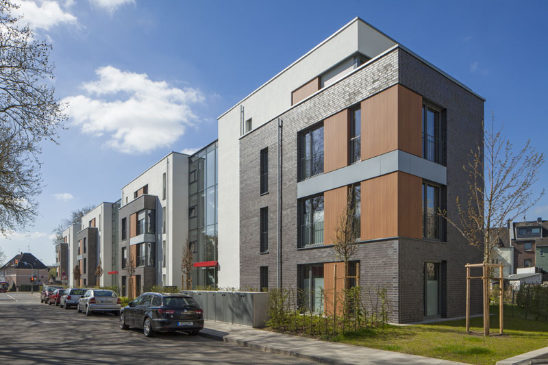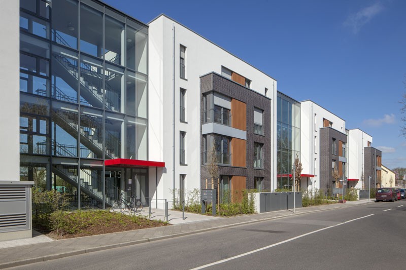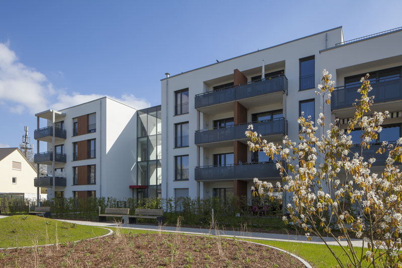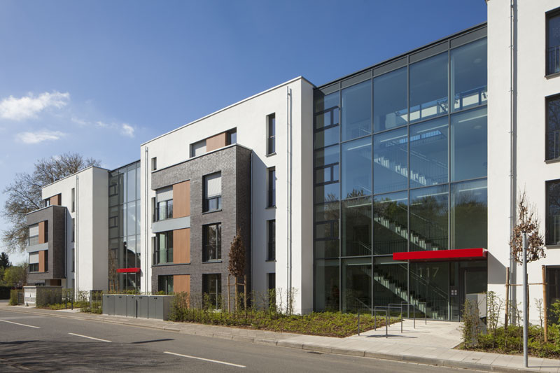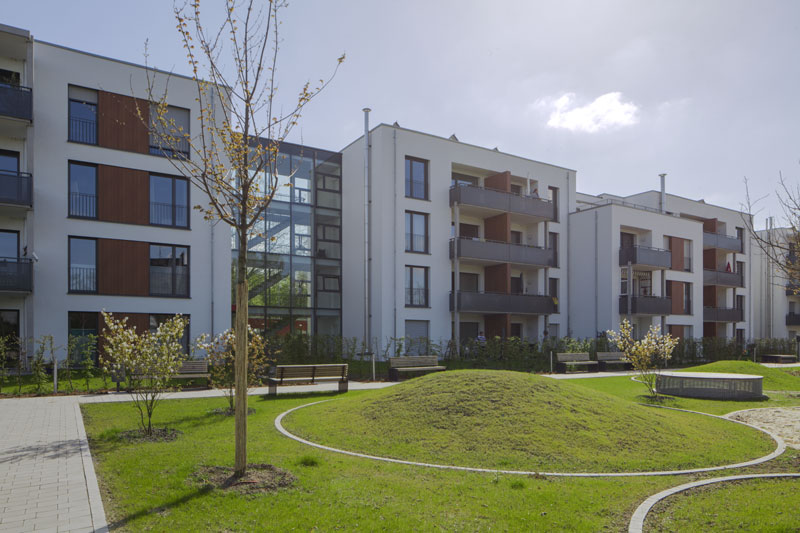 Die viergeschossigen Gebäude zeichnen sich durch miteinander verbundene und transparent verglaste Treppenhäuser aus, die einen lärmgeschützten Innenbereich mit hoher Aufenthaltsqualität haben entstehen lassen. Für den Gebäudekomplex stehen zwei Tiefgaragen zur Verfügung. Alle Etagen sind über Aufzüge zu erreichen und somit komplett barrierefrei, was die Wohnungen für Senioren attraktiv macht.
