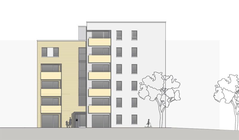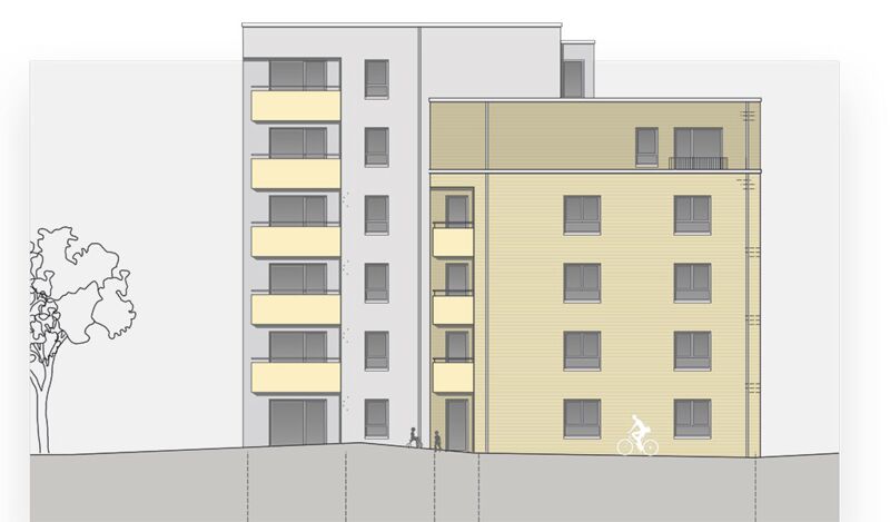 In unmittelbarer Nähe des Universitätsklinikums und der Universität baut die SWD seit Anfang dieses Jahres insgesamt 21 öffentlich geförderte Wohnungen mit über 1.300 m2 Wohnfläche auf einem Grundstück, das bislang als Parkplatz diente. Zwei miteinander verbundene Teilgebäude mit Flachdächern werden sich in die bisherige teils sechsgeschossige Bestandsbebauung einfügen. Im Grundriss aus der Vogelperspektive sehen die beiden Gebäude wie zwei fast quadratische Rechtecke aus, die an einer Ecke verbunden sind. Ein Gebäude wird über fünf Etagen und ein begrüntes Flachdach, das an dere sogar über sechs Etagen verfügen.