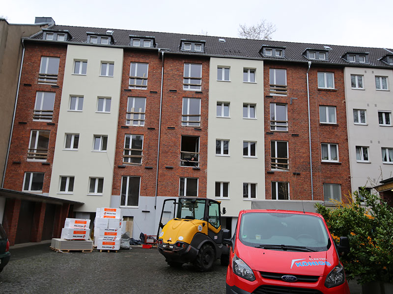 Die SWD-Häuser rund um die Burghofstraße in Bilk werden aktuell nach und nach in mehreren Bauabschnitten komplett saniert. Da die Häuser seit einigen Jahren unter Denkmalschutz stehen, ist eine Veränderung der Fassade ausgeschlossen. In enger Zusammenarbeit mit dem Denkmalamt konnte eine Lösung erarbeitet werden, die sowohl dem Denkmalschutz als auch den Anforderungen an die Schaffung von modernem Wohnraum gerecht wird.