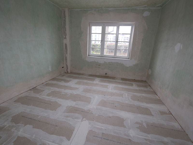 Eine Besonderheit ist, dass auf allen Etagen die Böden mit Dämmplatten belegt werden, um einen besseren Schallschutz zu erreichen. Auch energetisch wird viel getan: Die Kellerdecke wird gedämmt, damit die Mieter im Erdgeschoss keine kalten Füße mehr bekommen und zugleich der Energiebedarf gesenkt wird. Auch die Putzfassade der vorgebauten Erker, in denen sich die Küchen befinden, werden von außen gedämmt, neu verputzt und farblich wieder ins bestehende Gesamtbild integriert.