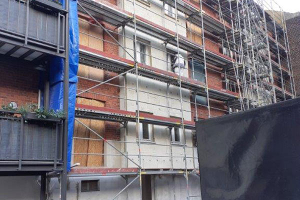 Parallel zu den Innenarbeiten wird an der Fassade gewerkelt. Die Erker, in denen sich die Küchen befinden, werden mit einem modernen Wärmeverbundsystem gedämmt, anschließend verputzt und farblich wieder ins Gesamtbild integriert. Im Anschluss werden die Vorbaubalkone montiert.